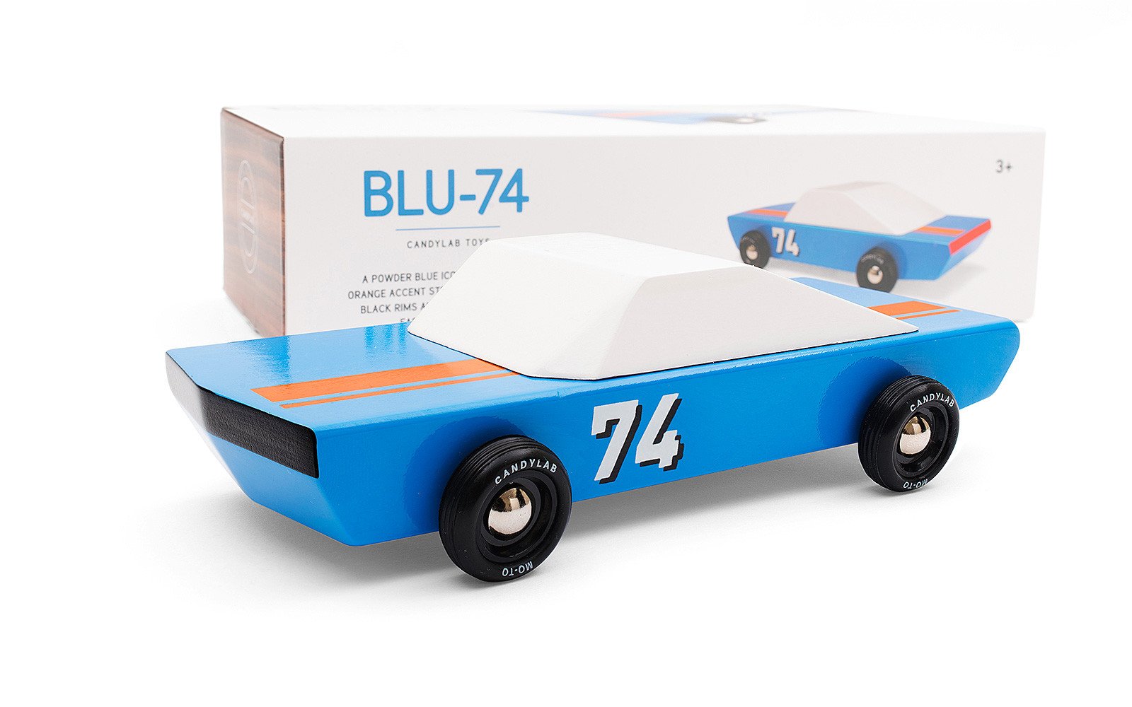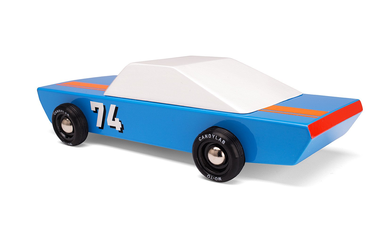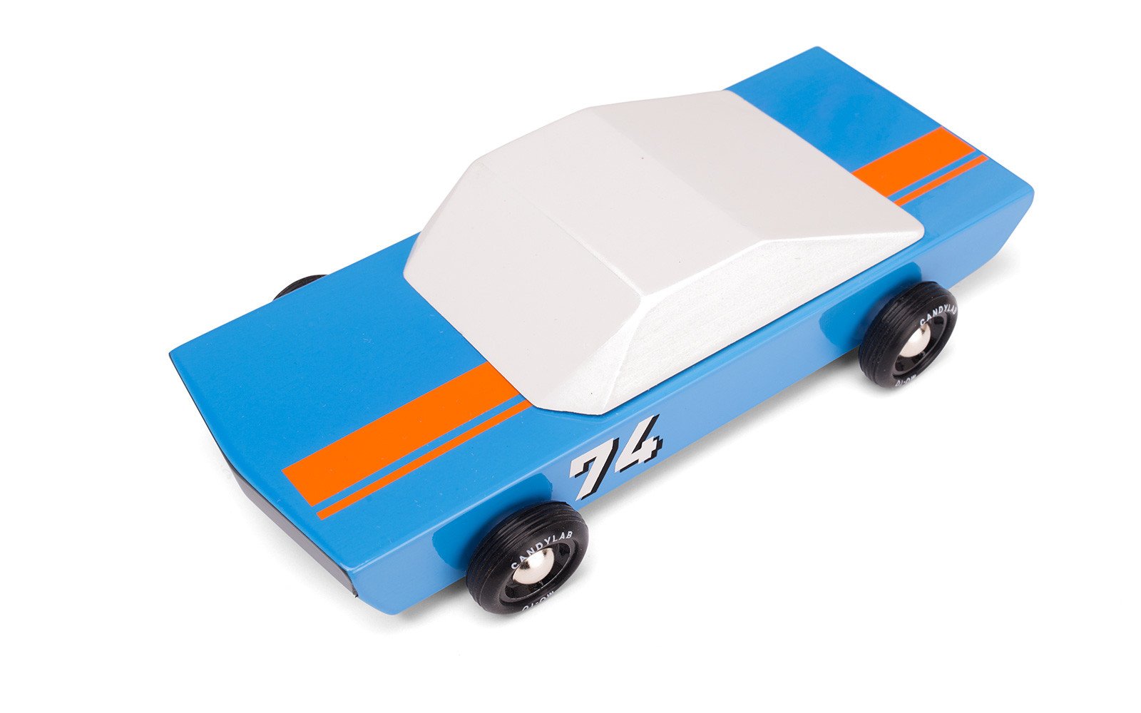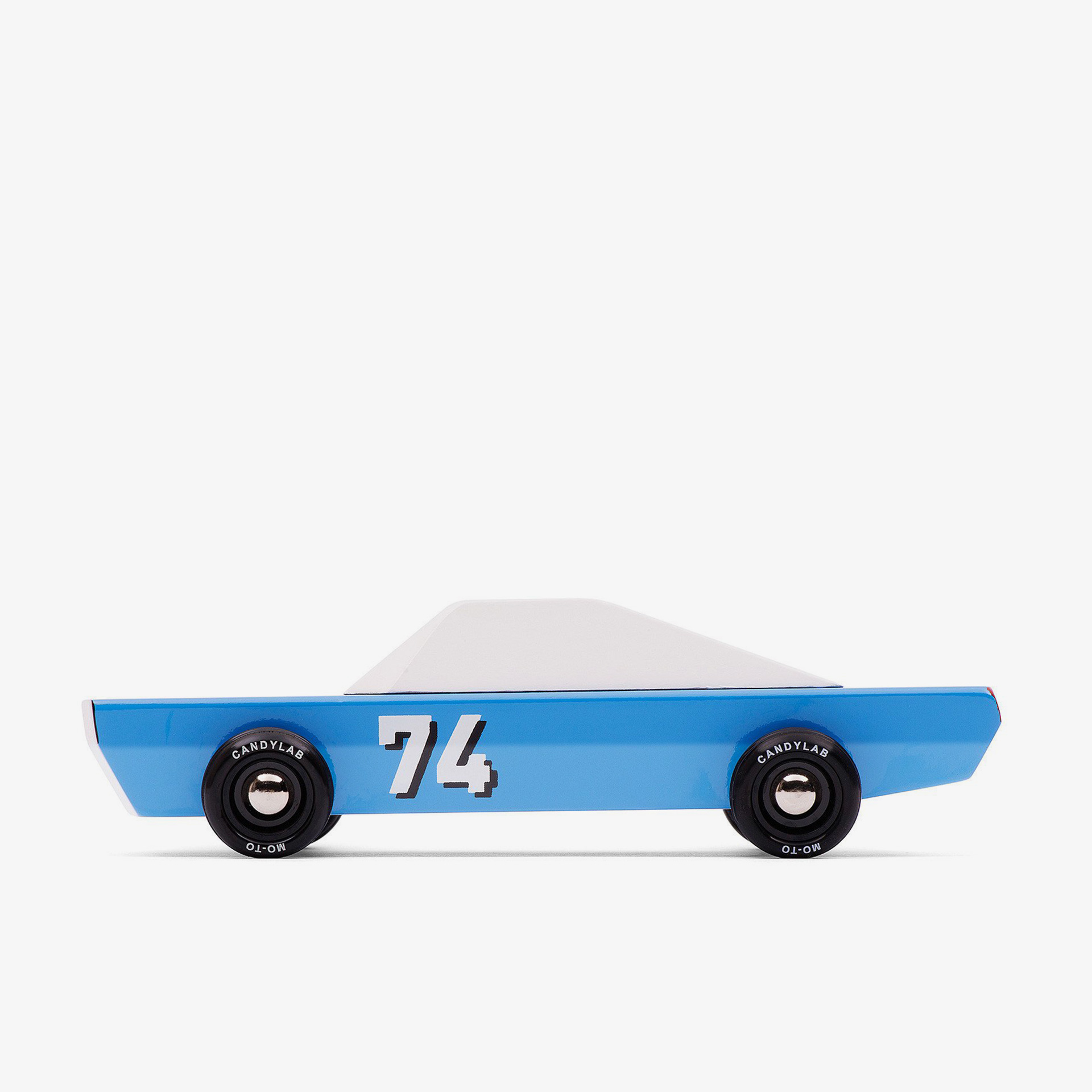 Slimmad racerbil med svarta fälgar, breda däck, vit kupé och en blå färg som inte går att missa.